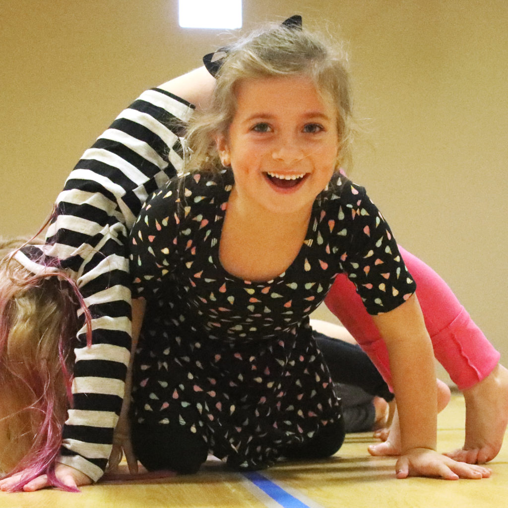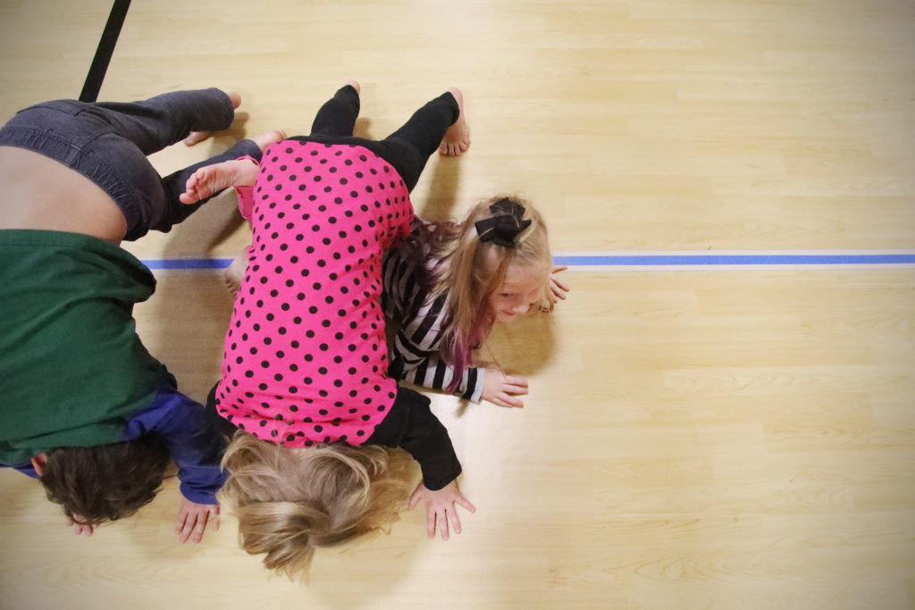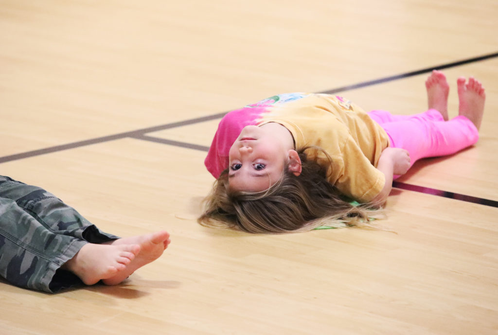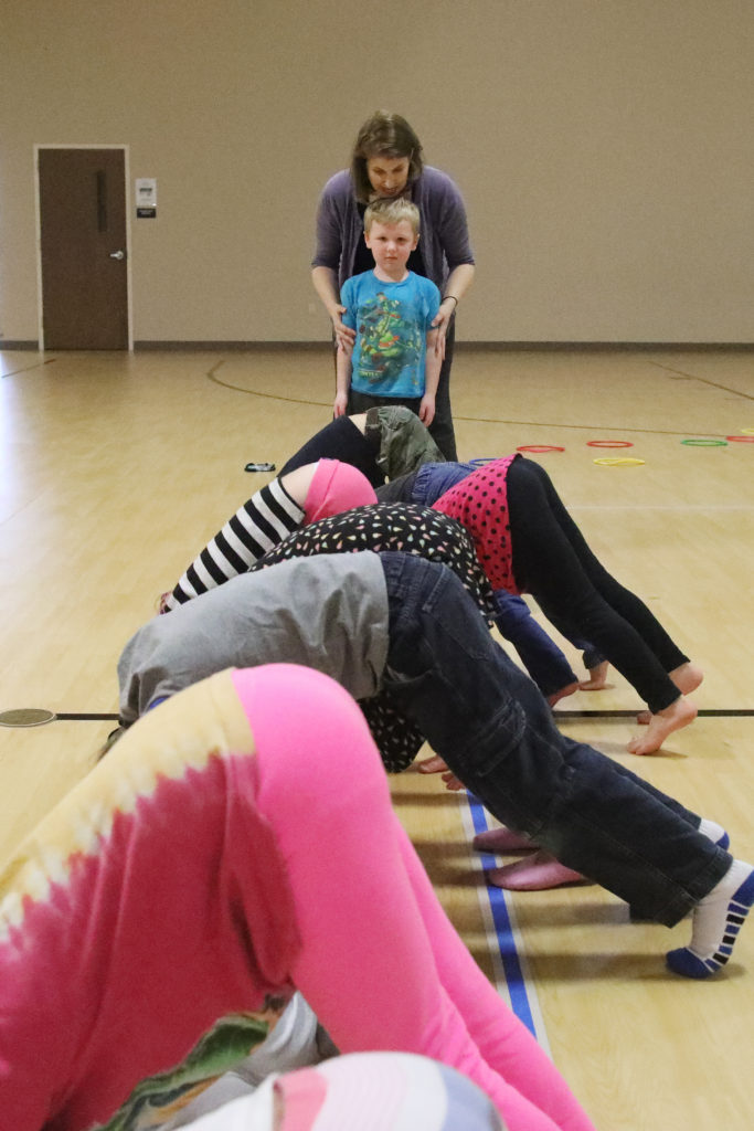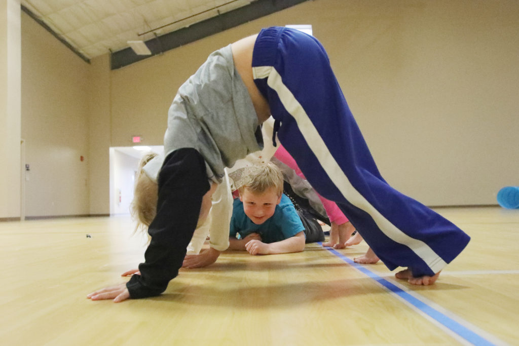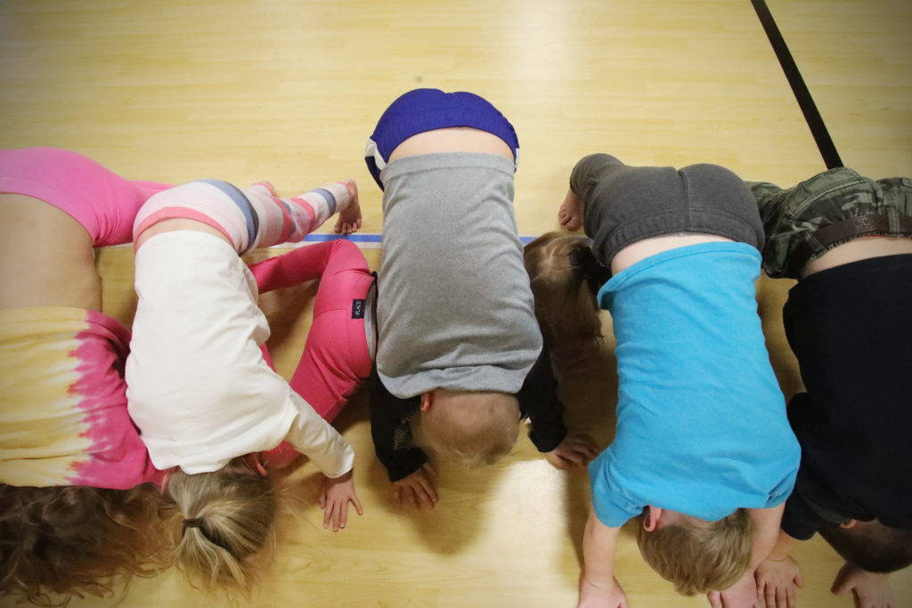 One of the last activities is probably the kiddos’ favorite. The human downward dog tunnel. Now, it probably has some proper name, but that is what I call it. The kids line up next to each other and each one gets down and does the downward dog pose…. then the first kid crawls through the opening all the way through! Each child gets a turn, giggling all the way. Toward the end, you can see the kids wobbling. They’re getting tired of holding themselves up, so they rock back and forth. It’s kinda fun to see the kids get worn out with all the fun they are having.