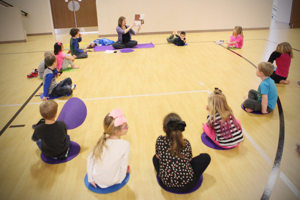 The class usually starts with yoga. Quieting down the kiddos takes a little bit of time, as it usually does with kids! She quietly reads, enticing the children to quiet down and listen to the story. Why is listening to the story so important in Jen’s yoga class, you may ask? Well, after the story, the students then do yoga poses mimicking the characters in the book! What a fun idea.