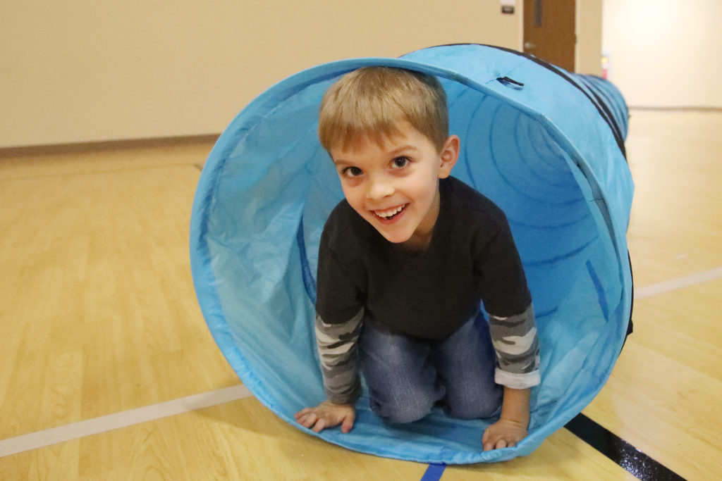 Remember obstacle courses? Jen sets one up for the kids to plow through. A tunnel, some rings and a line of tape make up a great course for the kids. Let’s wear ’em out! Haha.